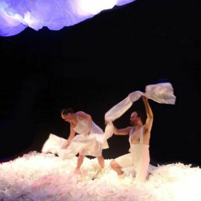 It all starts with a single sheet of white paper – then lots more! Paper is more than just a ‘material’: it’s an invitation to build, create shapes and set off on playful adventures. Landscape transforms into a fish, a sea, a moon, a dragon... Beneath the Snow is a playful visual production at the intersection of movement, music and objects. During this journey to the heart of the imagination, we gather around and close to the paper play area. The initial wonder. The first emotions. As if your eyes are looking out at the world around you for the very first time. And yes, at the end we all dive into the airy paper mountain!