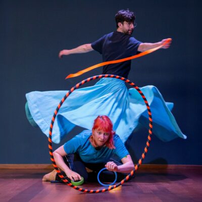 Alles kan draaien in OM en OM en OM. De paraplu, de hoepel, de stoel, de wereld – en jij en ik! Karlijn draait om, Bram draait om en om, Karlijn kan draaien om en om en om. Waar is Bram nou? Een voorstelling voor de allerkleinsten over verdwijnen en verschijnen, over reiken en pakken, over samen zijn – en dan weer even alleen. Wat weg is, komt terug. Wat ver lijkt, komt dichtbij. Soms zie je iets pas als je even omkijkt. En als de laatste draai gedraaid is, mogen de kinderen zelf tollen, dansen en hun eigen draai vinden. Nog een keer?