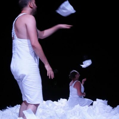 It all starts with a single sheet of white paper – then lots more! Paper is more than just a ‘material’: it’s an invitation to build, create shapes and set off on playful adventures. Landscape transforms into a fish, a sea, a moon, a dragon... Beneath the Snow is a playful visual production at the intersection of movement, music and objects. During this journey to the heart of the imagination, we gather around and close to the paper play area. The initial wonder. The first emotions. As if your eyes are looking out at the world around you for the very first time. And yes, at the end we all dive into the airy paper mountain!
